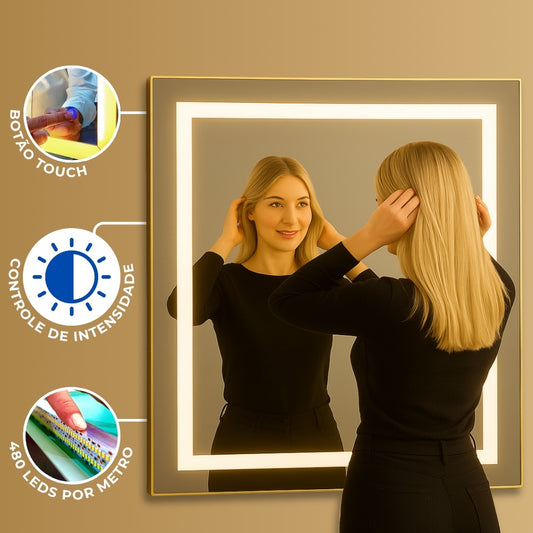 Espelho Jateado Led Botão Touch Quadrado Estrutura Alumínio 70x70